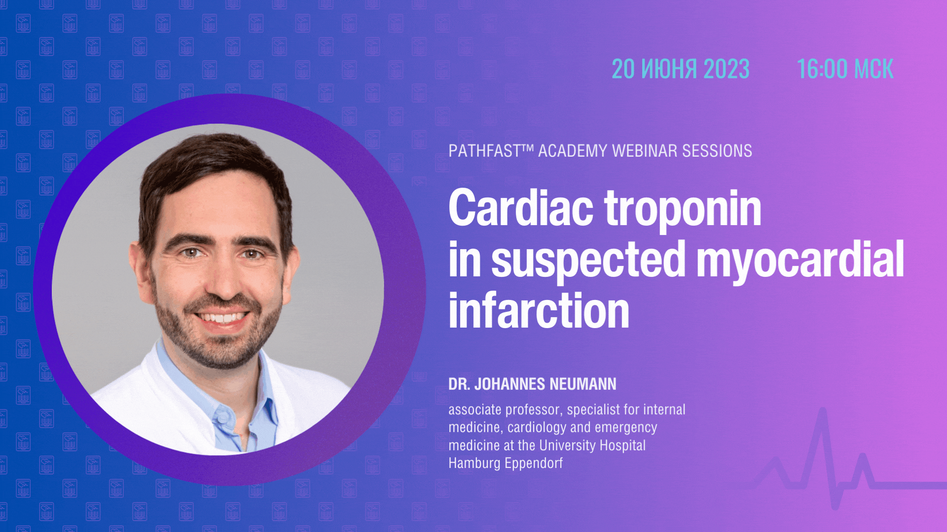 20 июня в 16:00 по МСК состоится вебинар Академии PATHFAST™ «Кардиальный тропонин при подозрении на инфаркт миокарда», его проведёт доктор Йоханнес Нойманн — доцент, специалист по внутренним болезням, кардиологии и неотложной медицине университетской больницы Гамбург Эппендорф.